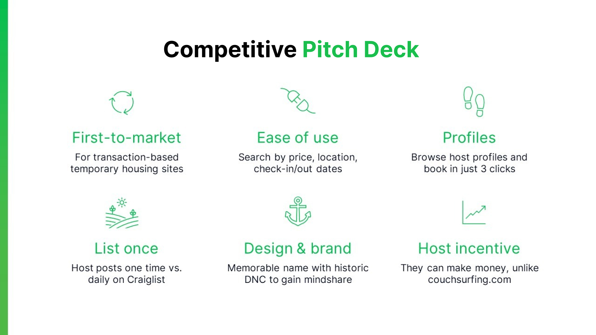 Used when a company competes in events or contests (e.g., startup competitions), focusing on innovation, market fit, business model, and why it's better than competitors.